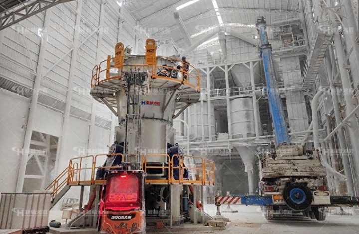 3. 超细粉碎:煅烧后的石灰均匀送入桂林鸿程HLMX超细立磨内部,经磨辊高效研磨成为细粉,随气流上升进入内置分级系统。