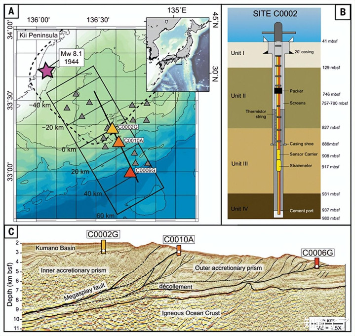 研究团队在日本海岸外的南海海槽(Nankai Trough)俯冲带附近的海底深处,部署了特殊的钻孔传感器。在那里,菲律宾海板块正俯冲到欧亚板块之下。研究人员将这种慢地震的活动比作构造缓冲带。