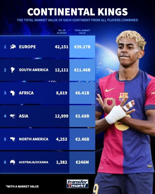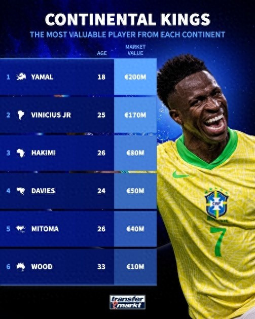 直播吧8月23日讯 德国转会市场列出了各大洲身价最高的球员,以及各大洲的球员总身价。